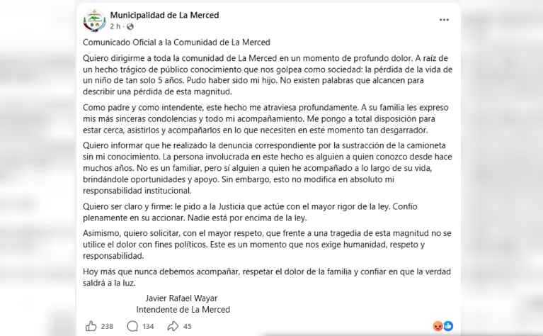 La muerte de Tomás, el niño de 5 años atropellado en La Merced, desató una ola de indignación en redes sociales que tiene como principal apuntado al intendente Javier Wayar.